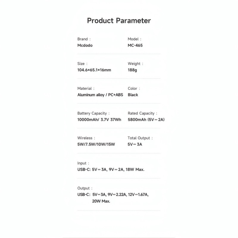 ابعاد: 16×65×104 میلیمتر وزن: 188 گرم ظرفیت اسمی: 10000 میلیآمپر ساعت جنس بدنه: آلیاژ آلومینیوم + ABS درگاه خروجی: تایپ C (حداکثر 20 وات) و پد شارژ وایرلس (حداکثر 15 وات)