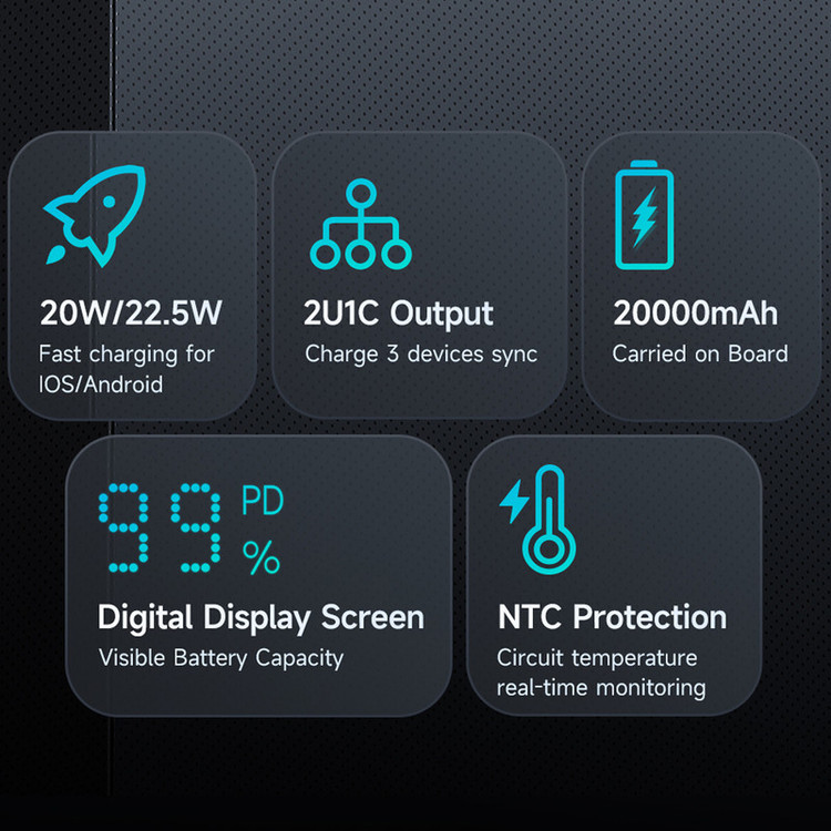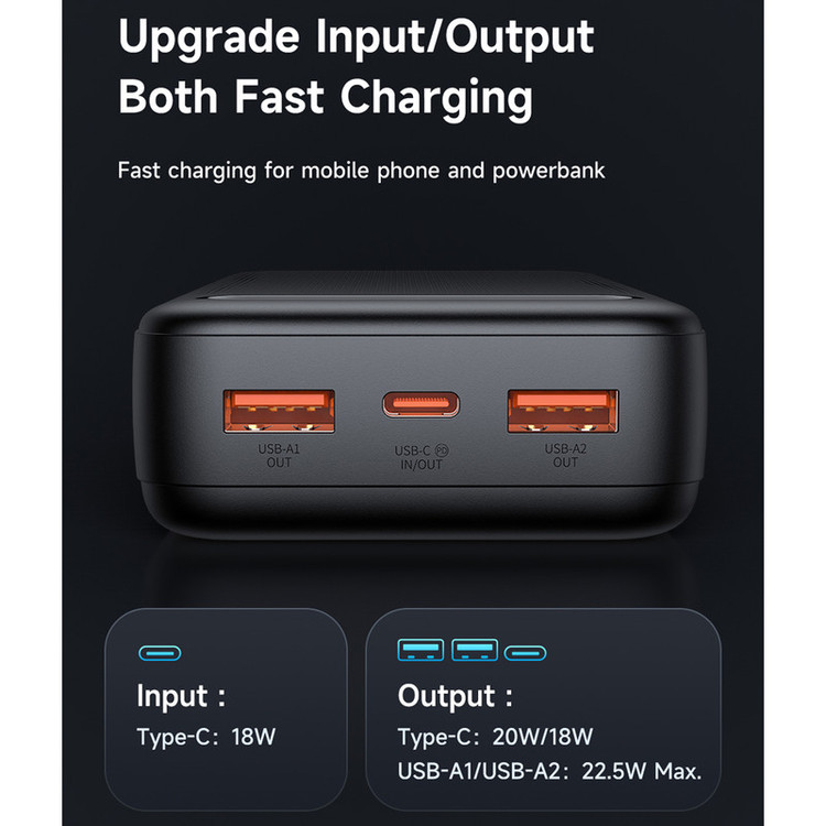 USB A1/A2 output : 4.5V⎓5A,5V⎓4.5A,5V⎓3A,9V⎓2A,12V⎓1.5A,22.5W Max. USB-C : 5V⎓3A,9V⎓2.22A,12V⎓1.67A,20W Max.