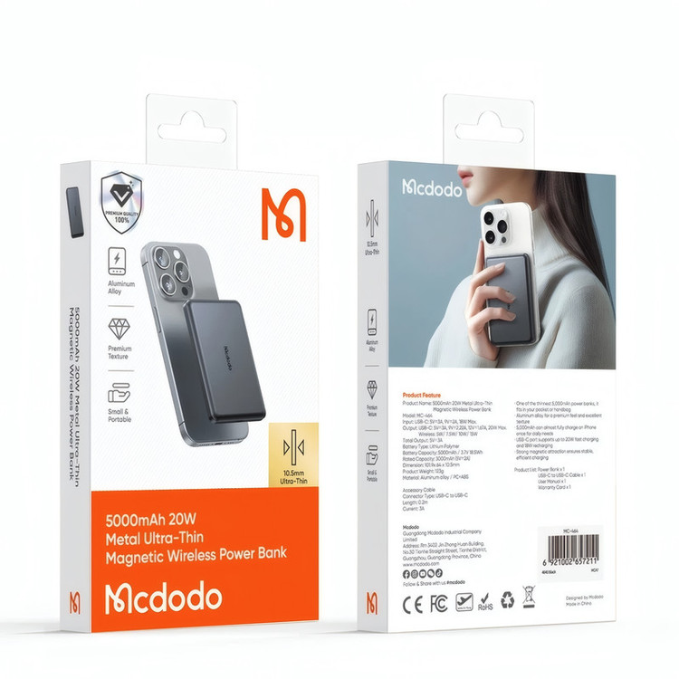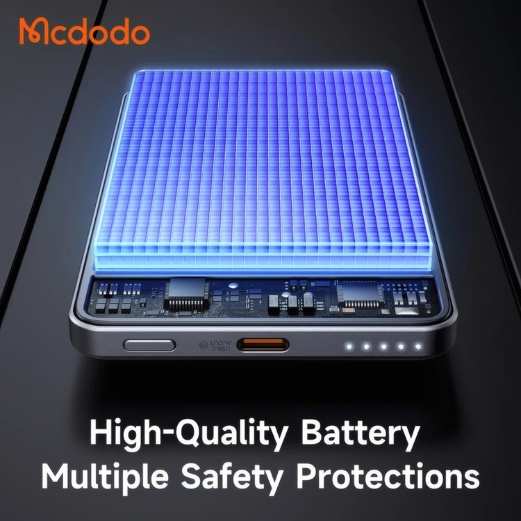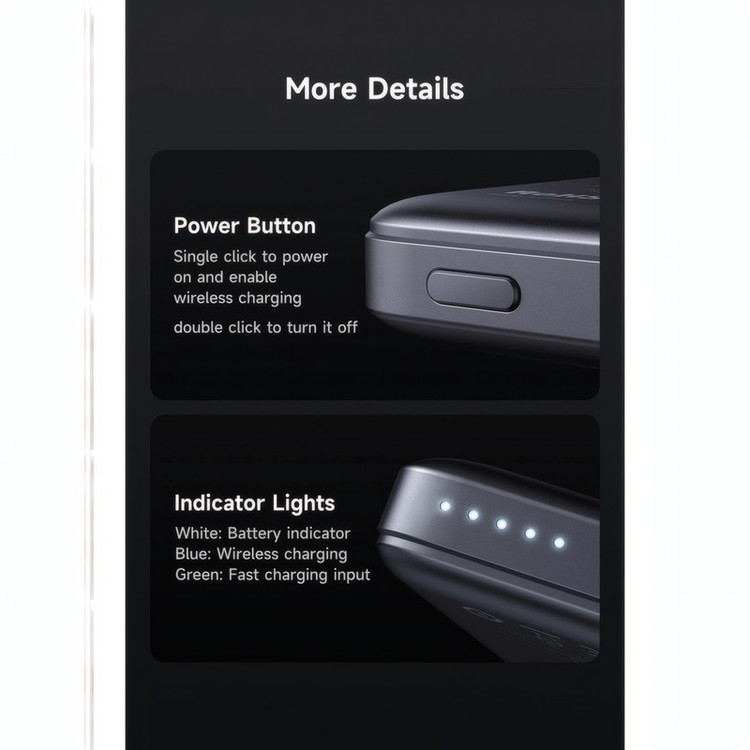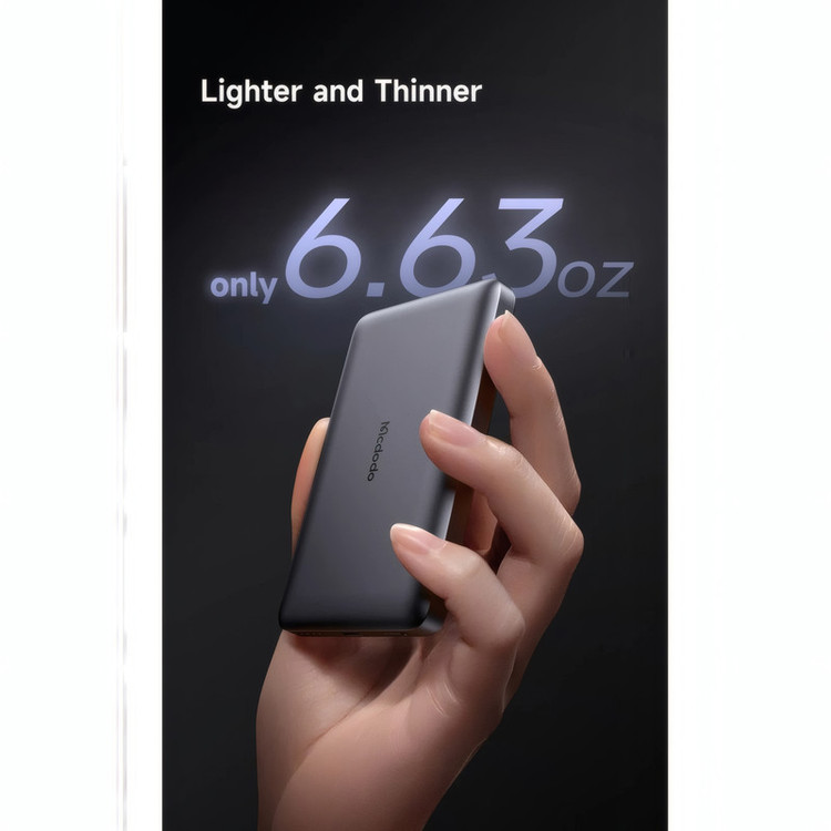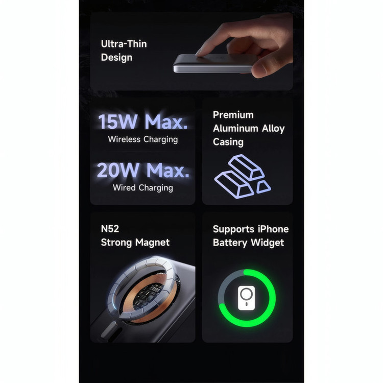 مشخصات فنی: ابعاد: 10.5×64×101 میلیمتر وزن: 123 گرم ظرفیت اسمی: 5000 میلیآمپر ساعت جنس بدنه: آلیاژ آلومینیوم + ABS درگاه ورودی: تایپ C (حداکثر 18 وات) درگاه خروجی: تایپ C (حداکثر 20 وات) و پد شارژ وایرلس (حداکثر 15 وات)