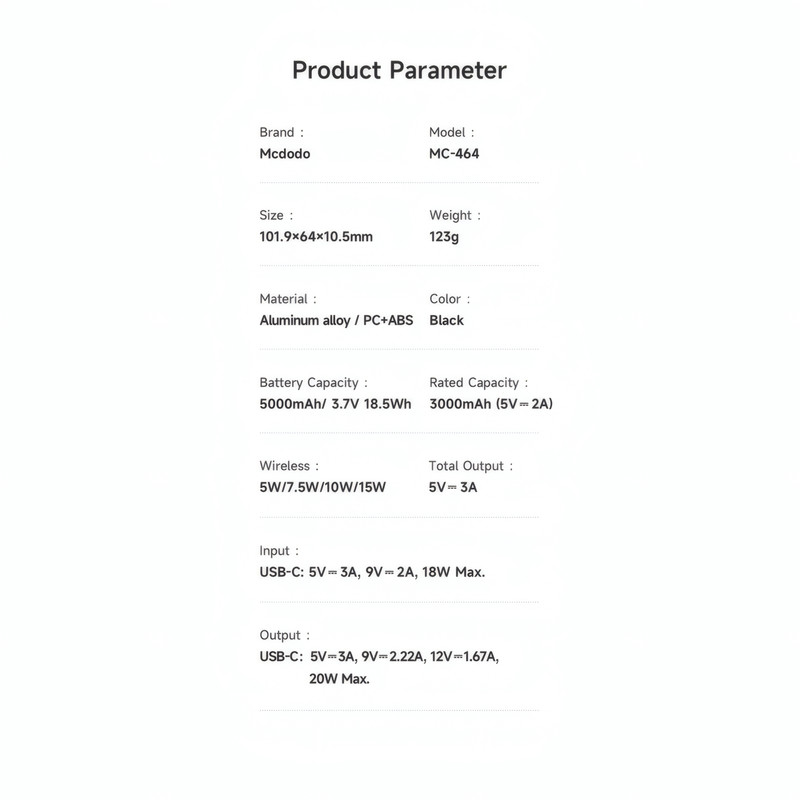 مشخصات فنی: ابعاد: 10.5×64×101 میلیمتر وزن: 123 گرم ظرفیت اسمی: 5000 میلیآمپر ساعت جنس بدنه: آلیاژ آلومینیوم + ABS درگاه ورودی: تایپ C (حداکثر 18 وات) درگاه خروجی: تایپ C (حداکثر 20 وات) و پد شارژ وایرلس (حداکثر 15 وات)
