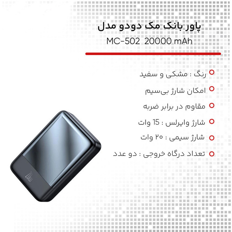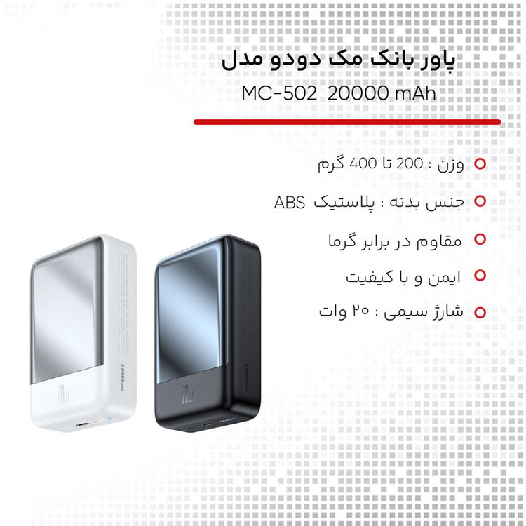 شرکت مک دودو یکی از شرکت های تولید کننده لوازم جانبی موبایل، تبلت و ... می باشد و به تازگی پاوربانک مک دودو مدل MC-502 ظرفیت 20000 میلی آمپر ساعت را طراحی و در بازار عرضه کرده است. پاوربانک مک دودو مدل MC-502 ظرفیت 20000 میلی آمپر ساعت دارای دو خروجی است که شامل یک پورت Type-c با توان 20 وات و جایگاه شارژ وایرلس با توان 15 وات می شود که پورت Type-C آن به صورت ورودی خروجی عمل میکند. برای استفاده از قابلیت شارژ وایرلس، تلفن همراه شما نیز باید قادر به پشتیبانی از این حالت باشد. این پاوربانک ظرفیت 20 هزار میلی آمپری داشته و علاوه بر تبلت و گوشی تلفن همراه، آن را به محصولی مناسب برای شارژ هندزفری و ساعت هوشمند شما تبدیل می کند. مشخصات ورودی خروجی به شرح زیر است: Type-C Input: 5V⎓3A | 9V⎓2 A Type-C Output: 5V⎓3A | 9V⎓2.22A | 12V⎓1.67A Wireless: 5W | 7.5W | 10W | 15W ظرفیت واقعی این پاوربانک 20000 میلی آمپر بسته به ولتاژ خروجی دستگاههای شما حدودا در رنج 12000 میلی آمپر خواهد بود. عواملی چون هدر رفت ظرفیت طی فرآیند تبدیل ولتاژ، استفاده از کابل نامناسب، استفاده از گوشی در حین شارژ توسط پاوربانک، باز بودن برنامه های زیاد در پس زمینه گوشی و ... می توانند در از دست رفتن ظرفیت پاوربانک تاثیر گذار باشند. این پاوربانک همچنین از مراجع مدنظر تاییدیه حمل در هواپیما دریافت کرده است. جنس بدنه ی این پاوربانک ساخته شده از پلاستیک ABS و PC بوده که همین امر موجب مقاومت قابل قبولی در برابر گرما و ضربه می شود. پاوربانک مک دودو مدل MC-502 ظرفیت 20000 میلی آمپر ساعت دارای استاندارد زیست محیطی ROHS نیز است؛ یعنی بسته بندی آن از موادی ساخته شده که در محیط زیست قابل بازیافت است. پس اگر به دنبال محصولی با ایمنی و کیفیت بالا هستید، پاوربانک مک دودو مدل MC-502 ظرفیت 20000 میلی آمپر ساعت انتخابی مناسب برای شما خواهد بود.