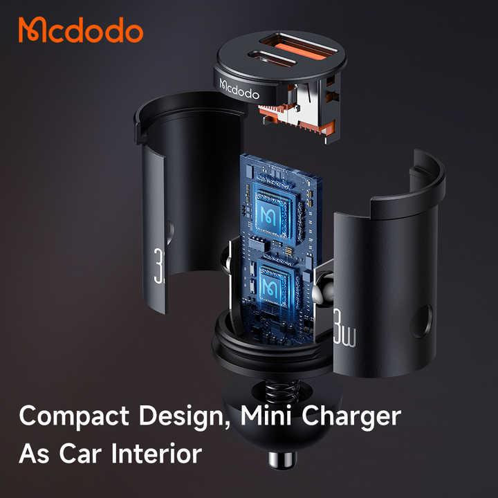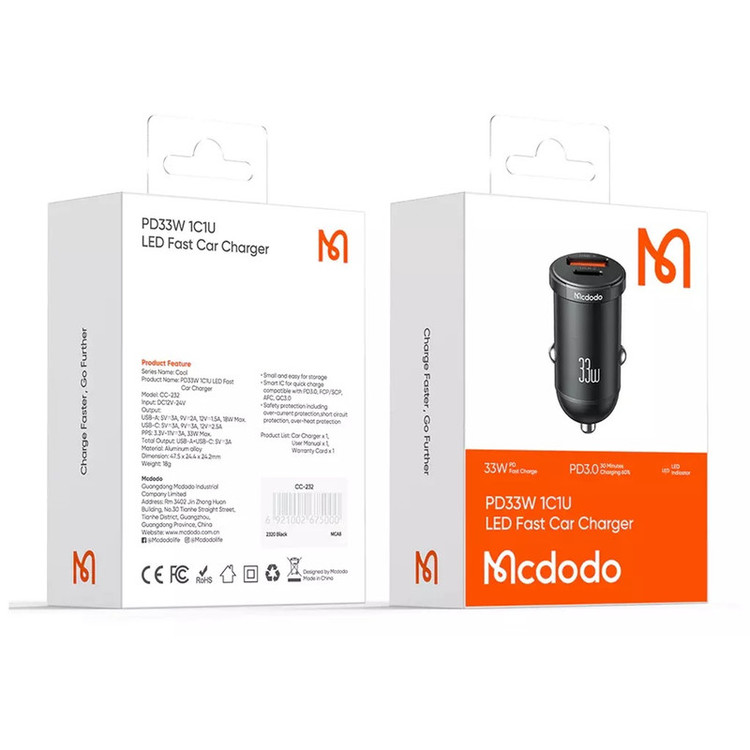 ر مواقع ضروری که درون خودروی خود هستید و نیاز به شارژر گوشی دارید و پاوربانک در دسترس نیست تا بتوانید به شارژ باتری گوشی بپردازید، شارژر فندکی به کمک شما میآید و به راحتی این دغدغده را رفع میکند. فروشگاه اینترنتی جانبی در این زمینه شارژر موبایل داخل ماشین CC-232 از برند مک دودو را به شما پیشنهاد میدهد که طراحی بسیار جذابی دارد؛ این محصول با داشتن یک درگاه USB-C و یک درگاه USB-A امکان شارژ همزمان دو دستگاه را برایتان فراهم کرده است. مینی شارژر فندکی Mcdodo CC-232 به دلیل استفاده از مواد اولیه با کیفیت در ساخت محصول از دوام و کیفیت قابل توجهی برخوردار است. جنس بدنه آن از آلیاژ آلومینیوم بسیار مقاوم در برابر ضربه، خوردگی، اکسید شدن ساخته شده است و علاوه بر این اتلاف سریع گرما در قطعات بهبود مییابد و انرژی گرمایی به سرعت آزاد میشود. همچنین کمپانی مک دودو برای این شارژر فندکی نشانگر LED طراحی کرده که در فضای تاریک داخل خودرو به راحتی بتوانید آن را پیدا کرده و استفاده کنید. یکی از ویژگیهای برجسته این شارژر 2 پورت مک دودو، طراحی کوچک آن است. ابعاد این شارژر 47.5x24.4x24.2 میلیمتر و وزن آن تنها 18 گرم است که آن را به یکی از شارژرهای فندکی کموزن و قابل حمل تبدیل کرده است. این ویژگیها به همراه عملکرد بالا و امنیت فراوان، این شارژر را یک انتخاب عالی برای استفاده در تمامی خودروهای (12V-24V) و سفرهای رانندگی میکند. روی بدنه شارژر مک دودو LED Car Charger CC-232 یک پورت Type-C با حداکثر توان خروجی 33 وات و یک عدد پورت USB-A با حداکثر توان خروجی 18 وات تعبیه شده است که شما میتوانید همزمان دو دستگاه را شارژ کنید. شارژر داخل ماشین مک دودو CC-232 Car Charger مجهز به انواع فناوریهای شارژ سریع PPS, PD, QC, AFC, FCP و غیره است که امکان شارژ در کوتاهترین زمان ممکن را برای شما به ارمغان میآورد. پورت Type-C با حداکثر توان خروجی 33 وات به شما این امکان را میدهد تا در 30 دقیقه، بتوانید گوشیهای موبایل آیفون را تا %60، گوشیهای سامسونگ را تا %62 و گوشیهای شیائومی را تا %65 به سرعت شارژ نمایید.