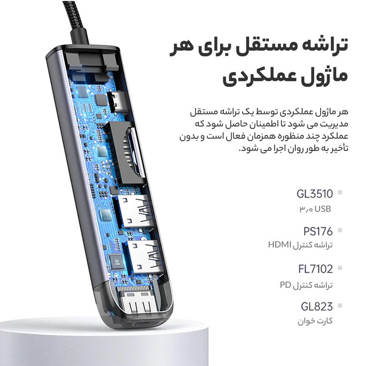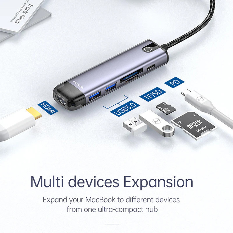هاب 6 پورت USB-C مک دودو مدل HU-7740 چند کاره مک دودو دارای کانکتور USB-C بوده و قابلیت شارژ گوشی، انتقال داده و اتصال کارت SD را دارا می باشد.ابعاد هاب چند کاره Mcdodo HU-7740; برابر با 1.85×4.2×30 سانتی متر بوده و 90 گرم می باشد. بدنه آن از آلیاژ آلومینیوم و طول کابل آن 15 سانتی متر است.در اطراف بدنه این هاب 6 پورت متفاوت قرار گرفته که امکان شارژ با USB (2PORT) ،اتصال HDMI 4K (3840x2160)و کارت حافظهSD/MicroSD را به کاربر می دهد.به کمک Type-c کاربر می تواند لپ تاپ یا هر وسیله دیگری را شارژ کند. حداکثر توان قابل انتقال به وسیله پورت PD برابر با 100 وات است.پورت تایپ سی این هاب فقط قابلیت شارژ دارد و برای انتقال اطلاعات نمی باشد.هاب مک دودو می تواند به درگاه تایپ سی لپ تاپ ها، تبلت ها و همینطور گوشی ها متصل شود و از سیستم های ویندور، Mac OS ، iPad OS و اندروید پشتیبانی می کند.فهرستی از موبایل و تبلت و لپ تاپ هایی که از قابلیت انتقال تصویر بوسیله پورت تایپ سی به HDMI پشتیبانی میکنند در تصاویر محصول موجود است.(USB3.1 و بالاتر)