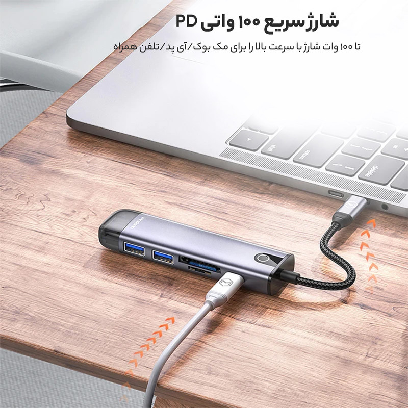 هاب 6 پورت USB-C مک دودو مدل HU-7740 چند کاره مک دودو دارای کانکتور USB-C بوده و قابلیت شارژ گوشی، انتقال داده و اتصال کارت SD را دارا می باشد.ابعاد هاب چند کاره Mcdodo HU-7740; برابر با 1.85×4.2×30 سانتی متر بوده و 90 گرم می باشد. بدنه آن از آلیاژ آلومینیوم و طول کابل آن 15 سانتی متر است.در اطراف بدنه این هاب 6 پورت متفاوت قرار گرفته که امکان شارژ با USB (2PORT) ،اتصال HDMI 4K (3840x2160)و کارت حافظهSD/MicroSD را به کاربر می دهد.به کمک Type-c کاربر می تواند لپ تاپ یا هر وسیله دیگری را شارژ کند. حداکثر توان قابل انتقال به وسیله پورت PD برابر با 100 وات است.پورت تایپ سی این هاب فقط قابلیت شارژ دارد و برای انتقال اطلاعات نمی باشد.هاب مک دودو می تواند به درگاه تایپ سی لپ تاپ ها، تبلت ها و همینطور گوشی ها متصل شود و از سیستم های ویندور، Mac OS ، iPad OS و اندروید پشتیبانی می کند.فهرستی از موبایل و تبلت و لپ تاپ هایی که از قابلیت انتقال تصویر بوسیله پورت تایپ سی به HDMI پشتیبانی میکنند در تصاویر محصول موجود است.(USB3.1 و بالاتر)