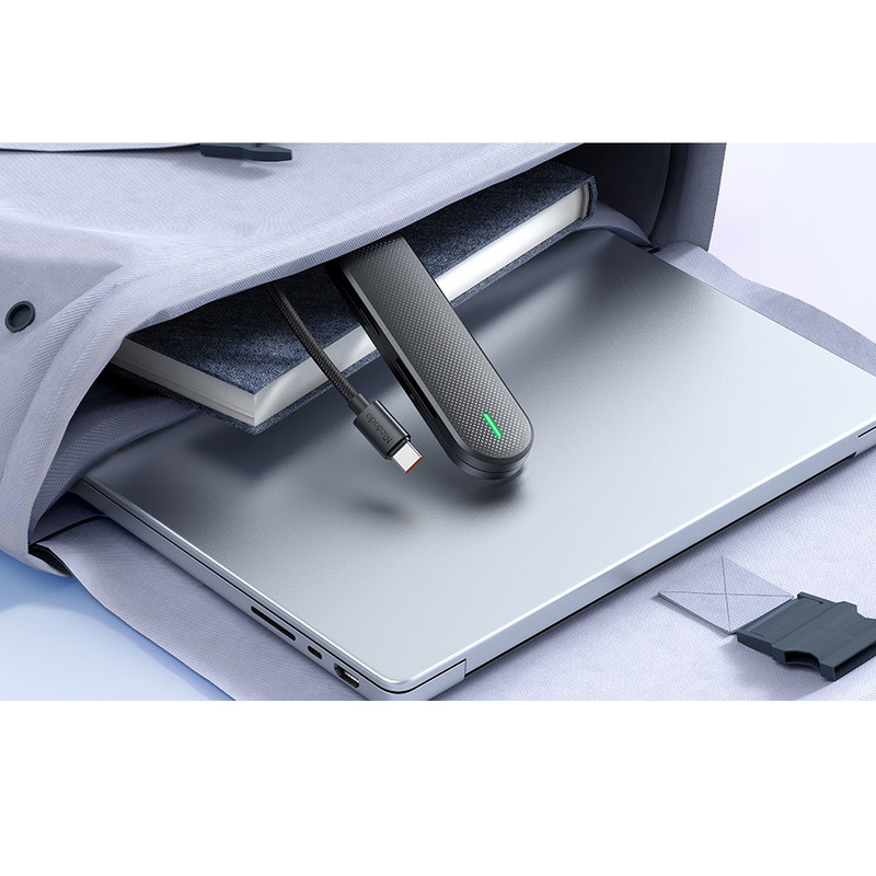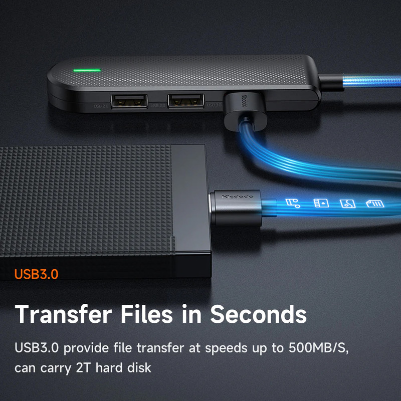 هاب چند کاره مک دودو Mcdodo HU1430 5 in 1 USB C HUB است بسیار پیش می آید که تصمیم می گیریم چندین فلش یا هارد را هم زمان به کامپیوتر یا لپ تاپ وصل کنیم. ولی از آنجایی که درگاه های کامپیوتر محدود است برای این کار به یک هاب چند منظوره نیاز خواهیم داشت. خرید هاب چند منظوره مک دودو Mcdodo HUI43 یکی از راه های حل این مشکل است. از آنجایی که سیستم های کامپیوتری معمولا 3 درگاه USB دارند در صورتی که ما نیاز به درگاه های بیشتری داشته باشیم یا بخواهیم لپ تاپ را به تلویزیون وصل کنیم باید از یک هاب مرکزی کمک بگیریم. هاب چند کاره مک دودو دارای کانکتور USB-C بوده و قابلیت انتقال داده از گوشی، فلش و هارد به کامپیوتر را دارا می باشد. ابعاد هاب شارژ مک دودو Mcdodo HUI43 برابر با 110x30x12.3 سانتی متر بوده و 29 گرم می باشد. بدنه آن از آلیاژ آلومینیوم و طول کابل آن 15 سانتی متر است. همانطور که می بینیم هاب چند کاره مک دودو مدل HUI43 ابعاد بزرگی ندارد و به راحتی قابل حمل و جا به جایی می باشد. در اطراف بدنه این هاب 5 پورت متفاوت به منظور اتصال فلش، هارد، میکرو اس دی و اس دی قرار گرفته است. این هاب مخصوصا مناسب لپ تاپ های مک بوک است که پورت های کمی روی بدنه دارد و برای اتصال دستگاه های دیگر به هاب نیازمند است. کانکتور هاب Mcdodo HUI43 از نوع Type C می باشد. این کانکتور می تواند به لپ تاپ و سیستم هایی که دارای درگاه تایپ سی هستند متصل شده و استفاده شود. کانکتور هاب Mcdodo HUI43 دارای پنج پورت خروجی شامل دو پورت USB 2.0 (با سرعت 480Mbps)، یک پورت USB 3.0 (با سرعت 5Gbps)، یک پورت میکرو اس دی و یک پورت اس دی است. هاب مک دودو Mcdodo HUI43 می تواند به درگاه تایپ سی لپ تاپ ها، تبلت ها و همینطور گوشی ها متصل شود و از سیستم های ویندور، Mac OS ، iPad OS و اندروید پشتیبانی می کند.