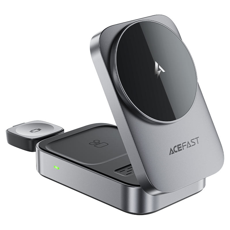 استند و شارژر وایرلس چندکاره مگ سیف ایس فست ACEFAST E22 یک محصول جمعوجور و چندمنظوره است که هم بهعنوان استند و هم شارژر بیسیم عمل میکند و قابلیت شارژ همزمان آیفون، اپل واچ و ایرپاد را دارد. طراحی تاشو و سبک با ابعاد 60×92×29 میلیمتر و وزن 150 گرم، حمل و استفاده از آن را آسان کرده است. پد شارژ گوشی با زاویه 60 درجه باز میشود و امکان قرار دادن گوشی به صورت عمودی یا افقی فراهم است.
