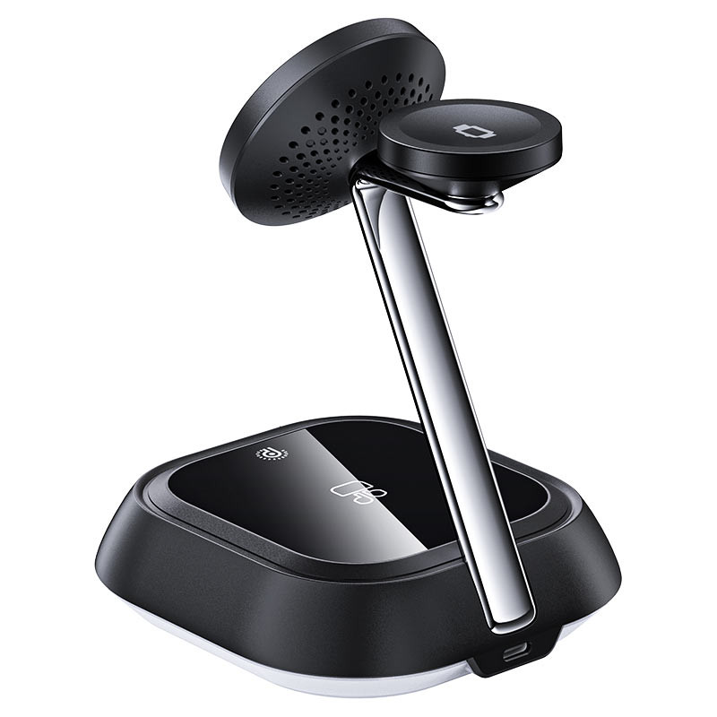 این استند از سه پنل شارژ جداگانه تشکیل شده است: پد گوشی با توان 15 وات، پد اپل واچ با توان 2.5 وات و پد ایرپاد با توان 3 وات. علاوه بر آن، روی بدنه پورت USB-C برای اتصال شارژر به جریان برق قرار دارد. طراحی چندمنظوره این شارژر، راحتی استفاده همزمان از چند دستگاه و نظم بخشی به میز کار را فراهم میکند.