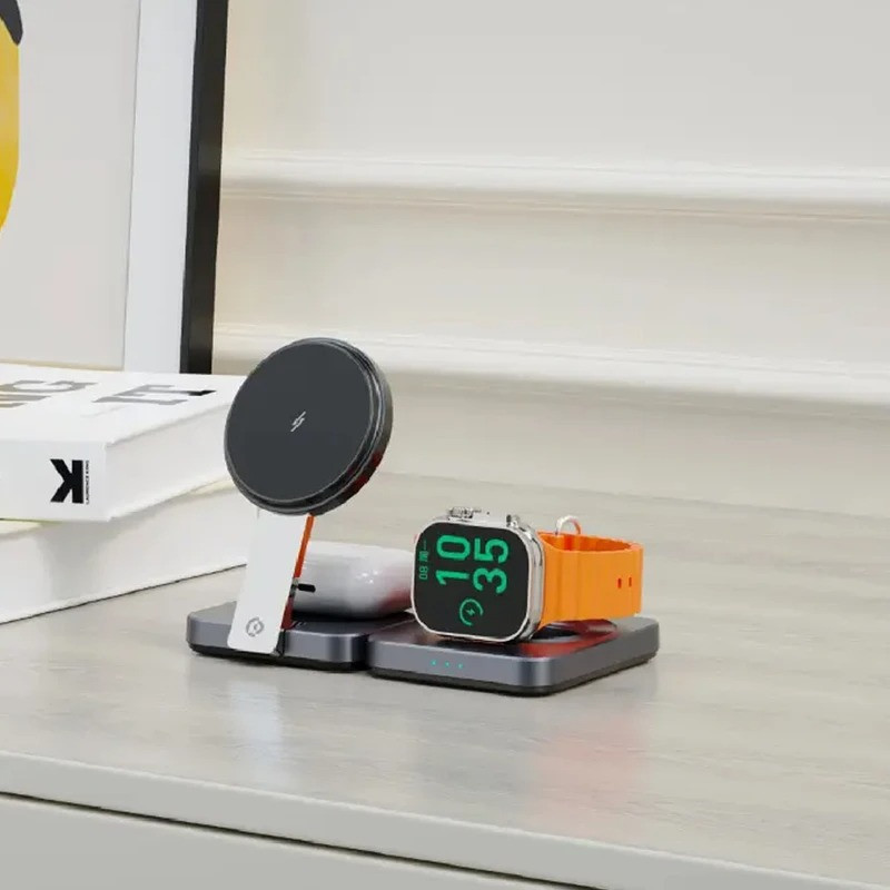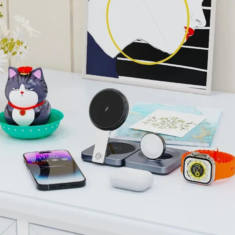 استند شارژ چند دستگاهی بیسیم ۱۵ واتی پاورولوجی مدل PWCUQC027، راهحلی شیک و کاربردی برای شارژ همزمان چندین گجت هوشمند شما است. این محصول با وزن ۲۵۰ گرم و طراحی تاشو، فضای کمی اشغال میکند و برای میز کار یا استفاده در سفر بسیار مناسب است. این شارژر از طریق کابل اتصال به منبع برق متصل میشود و برای استفاده نیازی به کابل یا اقلام همراه اضافی ندارد. قابلیت اصلی این دستگاه، شارژ سه گانه بیسیم برای تجهیزات مختلف شما است. این استند شارژ برای گوشیهای هوشمند سازگار با استاندارد Qi2، توان خروجی ۱۵ وات فراهم میکند، که در محدوده بیشترین توان خروجی ۱۱ تا ۲۰ وات قرار میگیرد و شارژ سریع و مؤثری ارائه میدهد. علاوه بر این، توان ۲.۵ وات برای شارژ ساعتهای هوشمند اپل و توان ۵ وات برای شارژ هدفونهای بیسیم سازگار در نظر گرفته شده است. این دستگاه از ولتاژ ورودی ۱۰۰ تا ۲۴۰ ولت پشتیبانی میکند و با تکنولوژیهای QC 3.0 (Quick Charge 3) و PD 1.0 (USB Power Delivery 1.0) سازگاری دارد. از ویژگیهای مهم این شارژر میتوان به وجود سیستم خنککننده فعال (Active Cooling System) اشاره کرد که به حفظ دمای ایمن دستگاه در طول شارژ کمک شایانی میکند. همچنین، ویژگیهایی مانند شارژ ایمن برای محافظت از دستگاههای شما در برابر آسیبهای احتمالی و نشانگر نوری برای اطلاع از وضعیت شارژ، تجربه کاربری مطلوبی ایجاد میکند. این محصول با تمامی گوشیهای سازگار با استاندارد Qi2 و مجهز به شارژ بیسیم، ساعتهای هوشمند اپل و هدفونهایی که از قابلیت شارژ بیسیم پشتیبانی میکنند، سازگاری کامل دارد و میتواند نیاز شارژ روزانه شما را به طور کامل پوشش دهد.